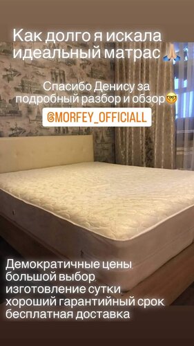 При поиске лучшего матраса я решила обратиться к Денису Владимировичу, и в итоге была удивлена такому качественному и быстрому результату. Матрас полностью соответствует заявленным требованиям. Так же в качестве подарка получила классные подушки. Я осталась очень довольна. Теперь буду всем рекомендовать фирму "Морфей"